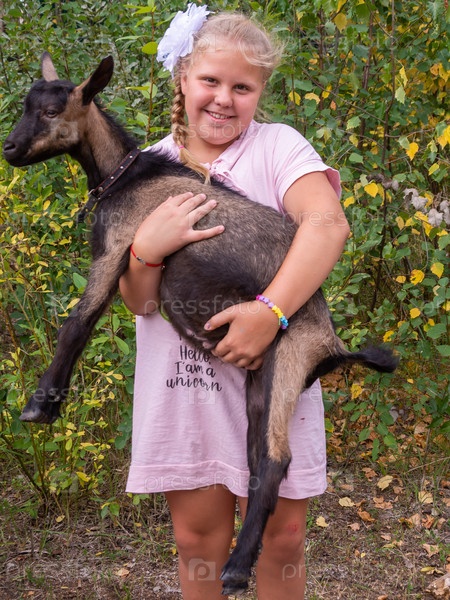 На улице в теплый летний день девушка держит маленького черного козленка на руках