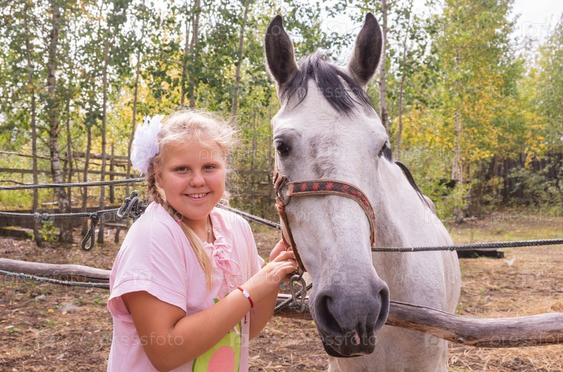 На улице в прекрасный теплый день девочка гладит лошадь