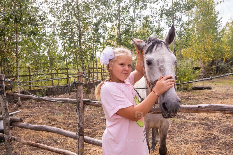 На улице в прекрасный теплый день девочка гладит лошадь