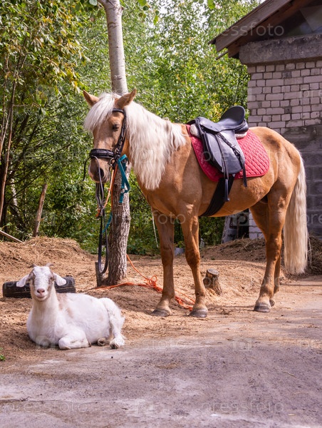 Красивая лошадь и коза отдыхают на улице в теплый летний день