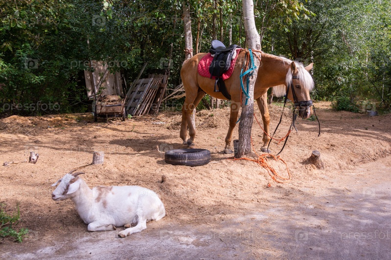 Красивая лошадь и коза отдыхают на улице в теплый летний день