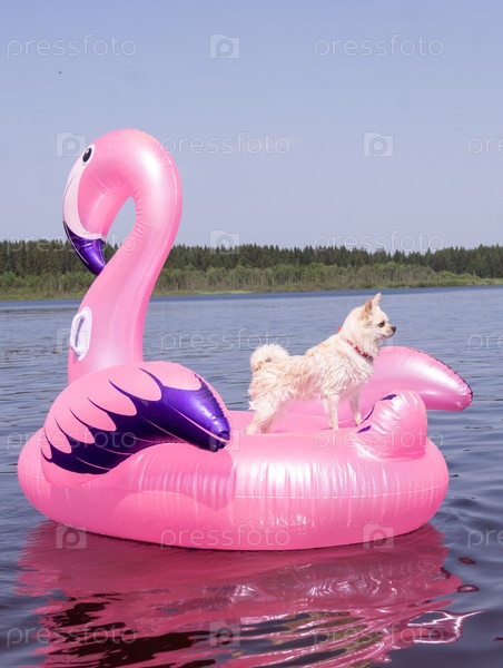 В жаркий летний день на озере маленькая белая собачка плавает на надувном розовом фламинго