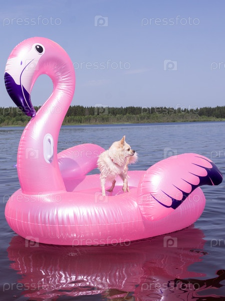 В жаркий летний день на озере маленькая белая собачка плавает на надувном розовом фламинго