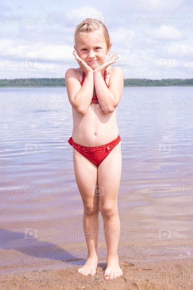 В жаркий летний день ребенок отдыхает на озере. Девочка на пляже. В знойный летний день ребёнок расслабляется у озера