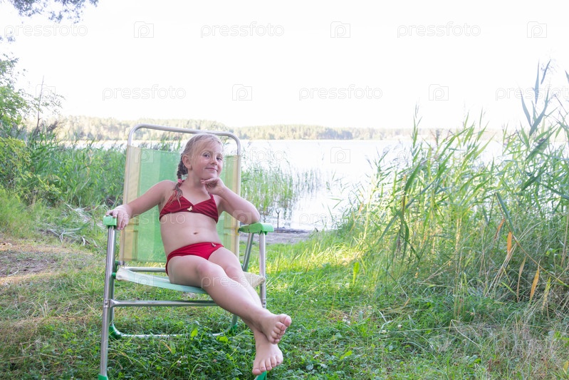 В жаркий летний день ребенок отдыхает на озере. Девочка на пляже. В знойный летний день ребёнок расслабляется у озера