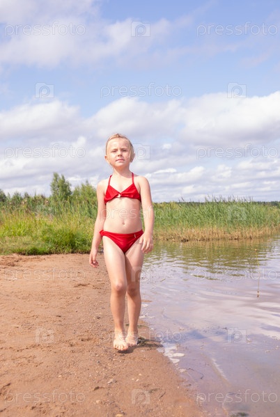 В жаркий летний день ребенок отдыхает на озере. Девочка на пляже. В знойный летний день ребёнок расслабляется у озера