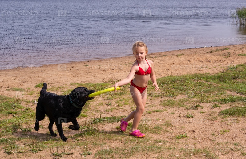 В жаркий летний день на улице красивая девочка играет с большой собакой