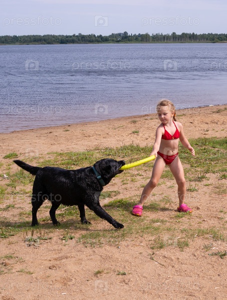 В жаркий летний день на улице красивая девочка играет с большой собакой