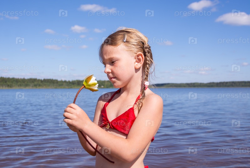 В жаркий летний день ребенок отдыхает на озере. Девочка на пляже. Девочка с белой водяной лилией. Водяная лилия, кувшинка, нимфея - растение семейства кувшинковых