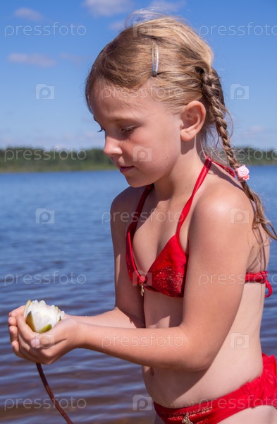 В жаркий летний день ребенок отдыхает на озере. Девочка на пляже. Девочка с белой водяной лилией. Водяная лилия, кувшинка, нимфея - растение семейства кувшинковых