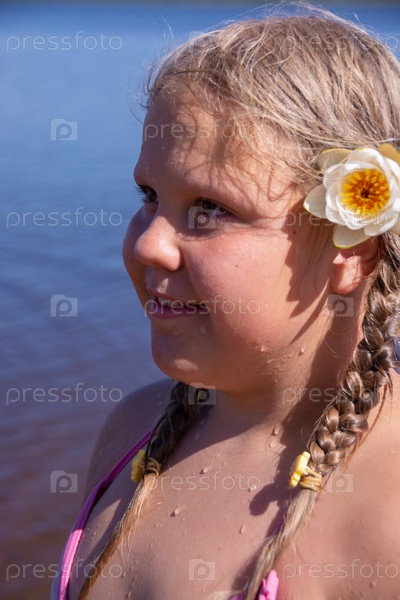 В жаркий летний день ребенок отдыхает на озере. Девочка на пляже. Девочка с белой водяной лилией. Водяная лилия, кувшинка, нимфея - растение семейства кувшинковых