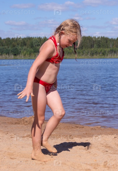 В жаркий летний день ребенок отдыхает на озере. Девочка на пляже. В знойный летний день ребёнок расслабляется у озера
