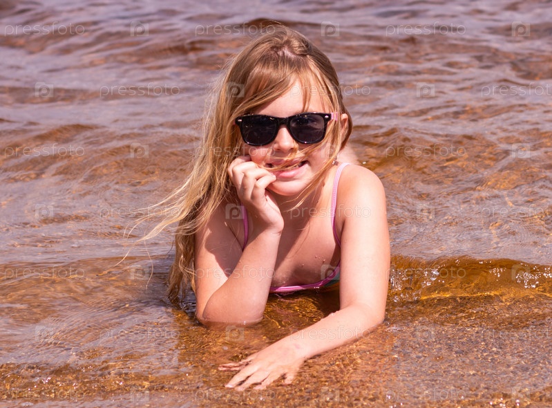 В жаркий летний день ребенок отдыхает на озере. Девочка на пляже. В знойный летний день ребёнок расслабляется у озера