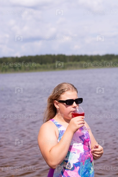 В жаркий летний день ребенок отдыхает на озере. Девочка на пляже. Девушка пьёт вкусный свежий сок. В жаркий летний день ребенок расслабляется на озере. Девушка на пляже. Девушка пьет восхитительный свежий сок