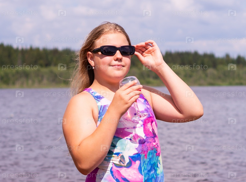 В жаркий летний день ребенок отдыхает на озере. Девочка на пляже. Девушка пьёт вкусный свежий сок. В жаркий летний день ребенок расслабляется на озере. Девушка на пляже. Девушка пьет восхитительный свежий сок