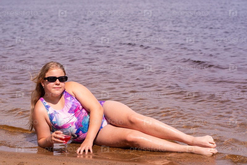 В жаркий летний день ребенок отдыхает на озере. Девочка на пляже. Девушка пьёт вкусный свежий сок. В жаркий летний день ребенок расслабляется на озере. Девушка на пляже. Девушка пьет восхитительный свежий сок