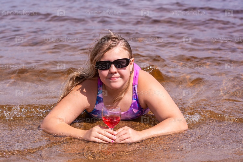 В жаркий летний день ребенок отдыхает на озере. Девочка на пляже. Девушка пьёт вкусный свежий сок. В жаркий летний день ребенок расслабляется на озере. Девушка на пляже. Девушка пьет восхитительный свежий сок