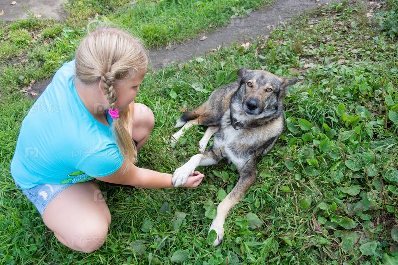 В жаркий летний день на улице красивая девочка играет с большой собакой