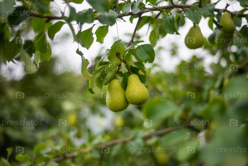 На садовом участке созревают крупные спелые сортовые груши. Фрукты. Крупные спелы сортовые груши созрели на садовом участке. Сбор урожая. Фрукты