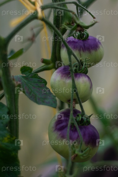 Большие необычные сорта фиолетовых помидоров созревают на ветке в теплице. овощи. выращивание овощей. большие необычные сортовые пурпурные помидоры созревают на ветви в теплице. овощи. выращивание овощей