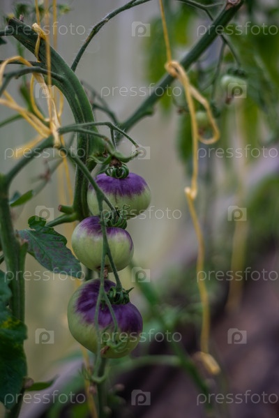 Большие необычные сорта фиолетовых помидоров созревают на ветке в теплице. овощи. выращивание овощей. большие необычные сортовые пурпурные помидоры созревают на ветви в теплице. овощи. выращивание овощей