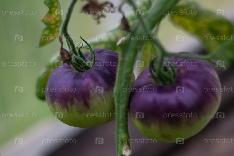 Большие необычные сорта фиолетовых помидоров созревают на ветке в теплице. овощи. выращивание овощей. большие необычные сортовые пурпурные помидоры созревают на ветви в теплице. овощи. выращивание овощей