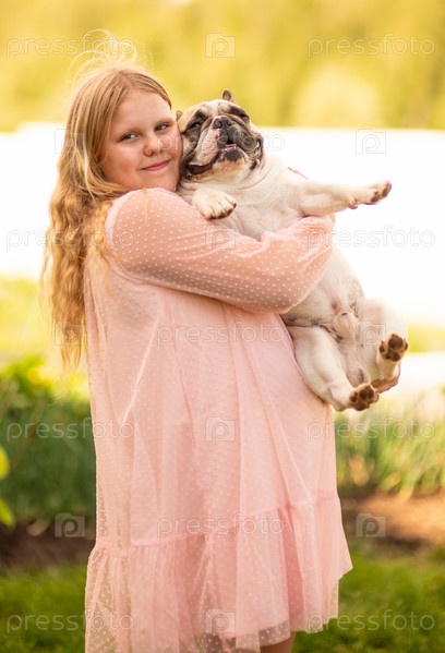 В жаркий летний день на улице красивая одетая девушка держит в руках французского бульдога. Девушка-модель и собака