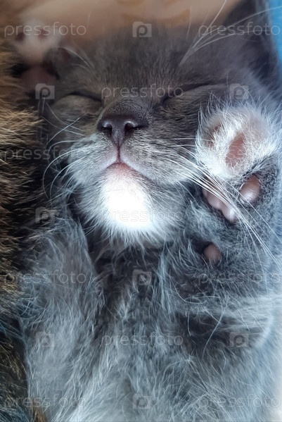 Милый серебристый котенок. Домашние животные спят в уютном домике. Забавные очаровательные кошки. Идея открытки