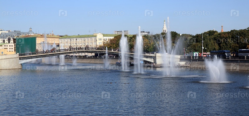 Много фонтанов на реке