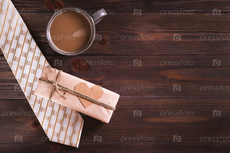 Подарок на день отца с сердцем на галстуке, кофейная кружка на деревянном столе, вид сверху
