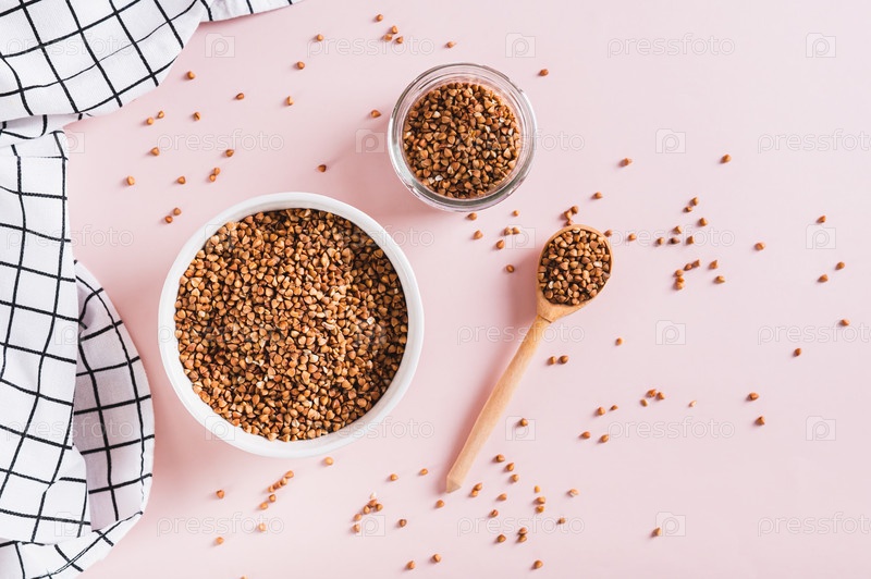 Сырая гречка в миске и деревянной ложкой на розовом фоне, вид сверху