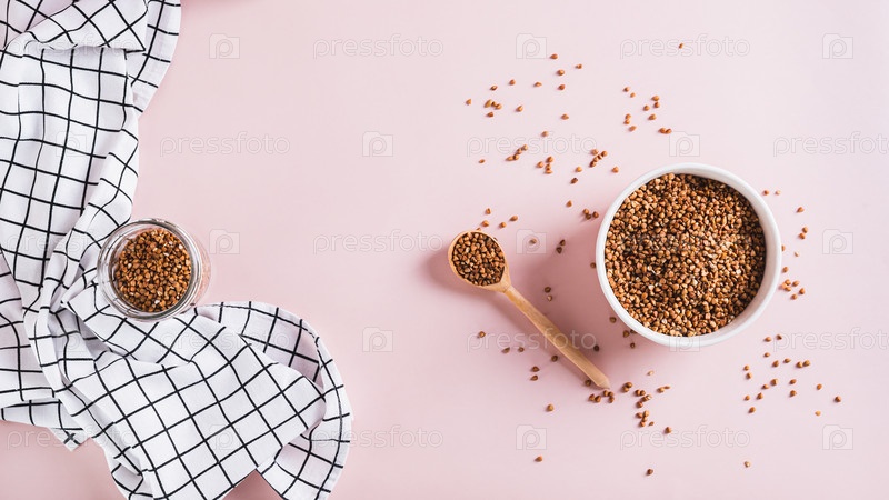 Белая миска с сырой цельнозерновой гречкой на розовом фоне, вид сверху веб-баннер