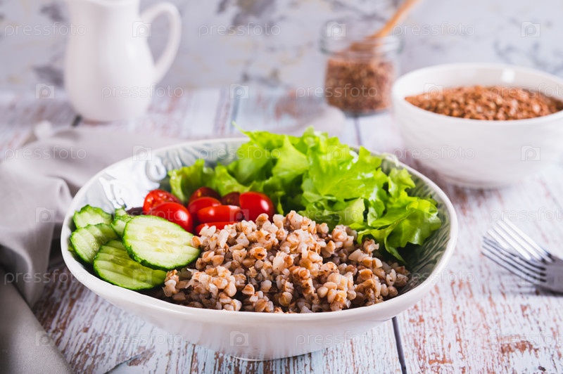 Миска с гречкой, огурцом, помидорами черри и салатом на столе для здорового обеда