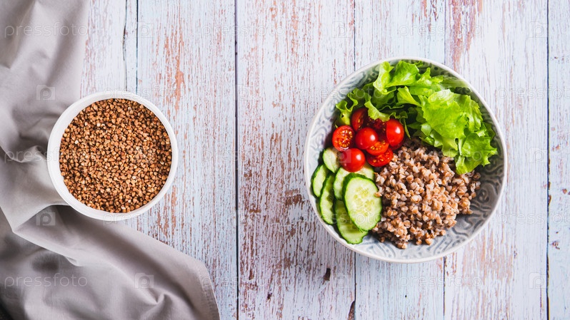 Вареная гречка, кусочки свежих овощей и зелени в миске на столе, вид веб-баннера