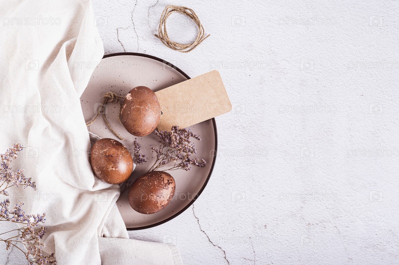 Домашние натуральные крашеные яйца на Пасху, открытка на тарелке и сушеные цветы, вид сверху