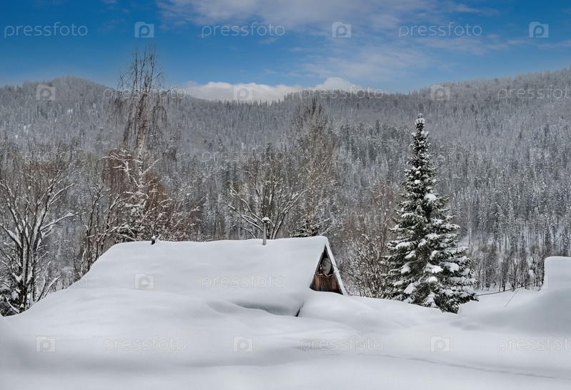 Россия. Кузнецкий Алатау. Зимний вид на дачный поселок Борисовка среди заснеженной непроходимой тайги на берегу реки Томь