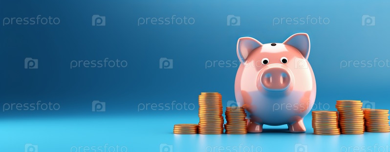 Розовая свинья-копилка рядом со стопкой золотых монет, изолированных на синем фоне. Инвестиционный успех, концепция сбережений