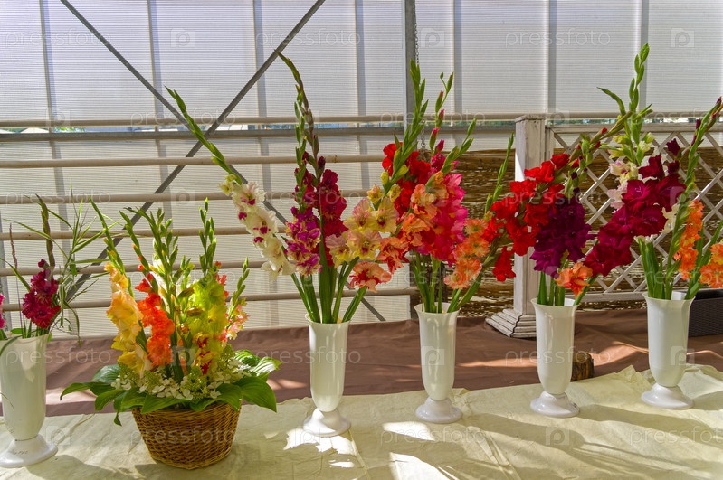 Букеты из красивых разноцветных гладиолусов. Выставка гладиолусов в оранжерее Аптекарского Огорода (филиал ботанического сада МГУ). Москва