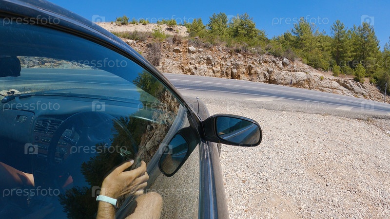 Автомобиль на извилистой горной дороге. Камера установлена на боковом стекле автомобиля. Видна часть салона и руки водителя