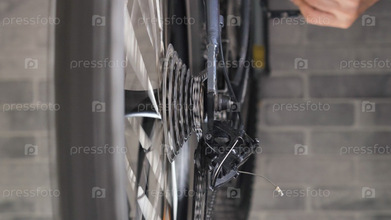 Крупный план вращающегося тормозного диска и спиц горного велосипеда. Ремонт и обслуживание велосипеда в специализированной мастерской