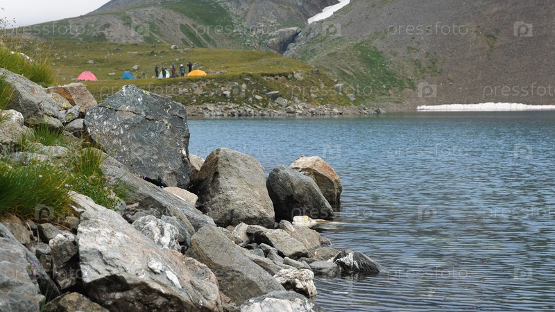 Голубое горное озеро. Поверхность воды колышется от ветра. Большие камни на переднем плане. Скалы и туристический лагерь вдалеке. Красочные палатки усеивают пейзаж