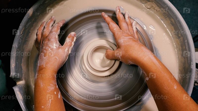 Женские руки, окрашенные глиной, формируют заготовку чашки из глины. Вид сверху. Работа на гончарном круге в мастерской. Крупный план. Понятие ручного труда, искусства и ремесла