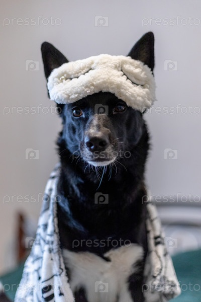 Черная домашняя собака в милой белой маске для сна / A black pet dog wearing a cute white sleeping mask