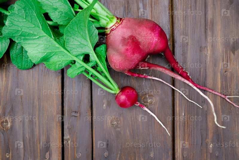 Красная редиска на деревянных досках. Понятие о различии сортов овощей. Полезные продукты с огорода для приготовления салата