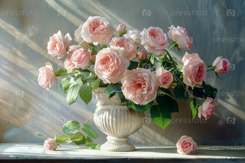 Букет розовых роз в белой вазе. Романтический цветочный натюрморт с розовыми розами