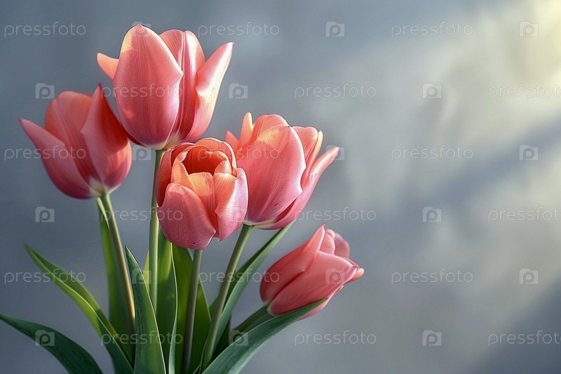 Розовые тюльпаны на светло-сером фоне в лучах солнца