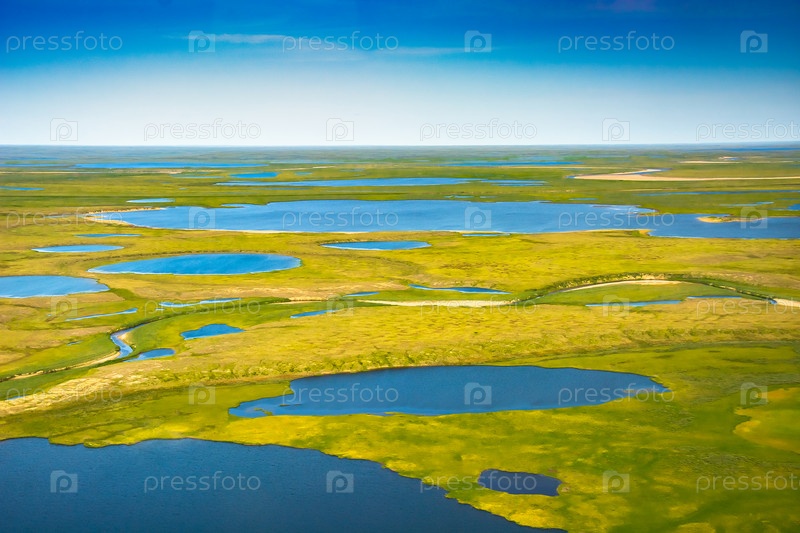 Пейзаж арктической тундры летом. Реки, озера, северная растительность. Вид сверху. Концепция изменения климата, потепление в Арктике