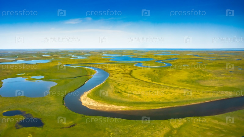 Пейзаж арктической тундры летом. Реки, озера, северная растительность. Вид сверху. Концепция изменения климата, потепление в Арктике