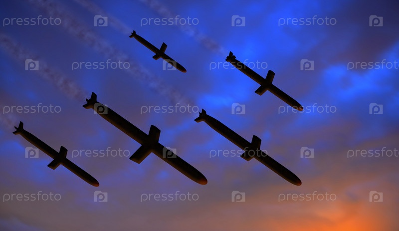Военные крылатые ракеты взлетают в небо. Массовая ночная бомбардировка. Запасный огонь. Иллюстрация силуэта ракеты. 3D-рендеринг
