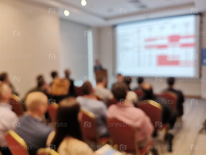Размытое фоновое изображение аудитории на бизнес-конференции или семинаре. Аудитория слушает лектора на конференции в аудитории